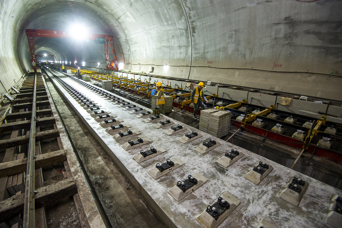 汉巴南铁路开始线上施工。图为工人在位于巴中市巴州区的光辉隧道里进行右线无砟道床浇筑施工。付海旭/摄