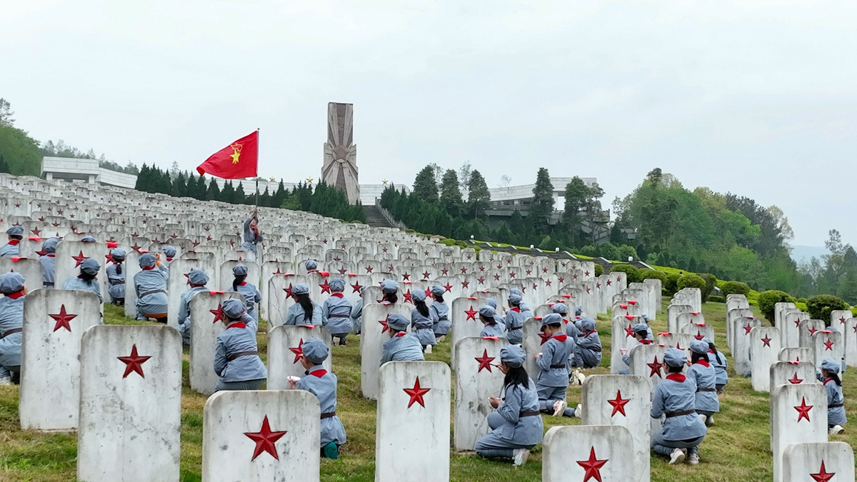 在川陕革命根据地红军烈士陵园,沙溪镇中心小学学生在为无名烈士纪念园墓碑上的五角星描红。施皓文/摄