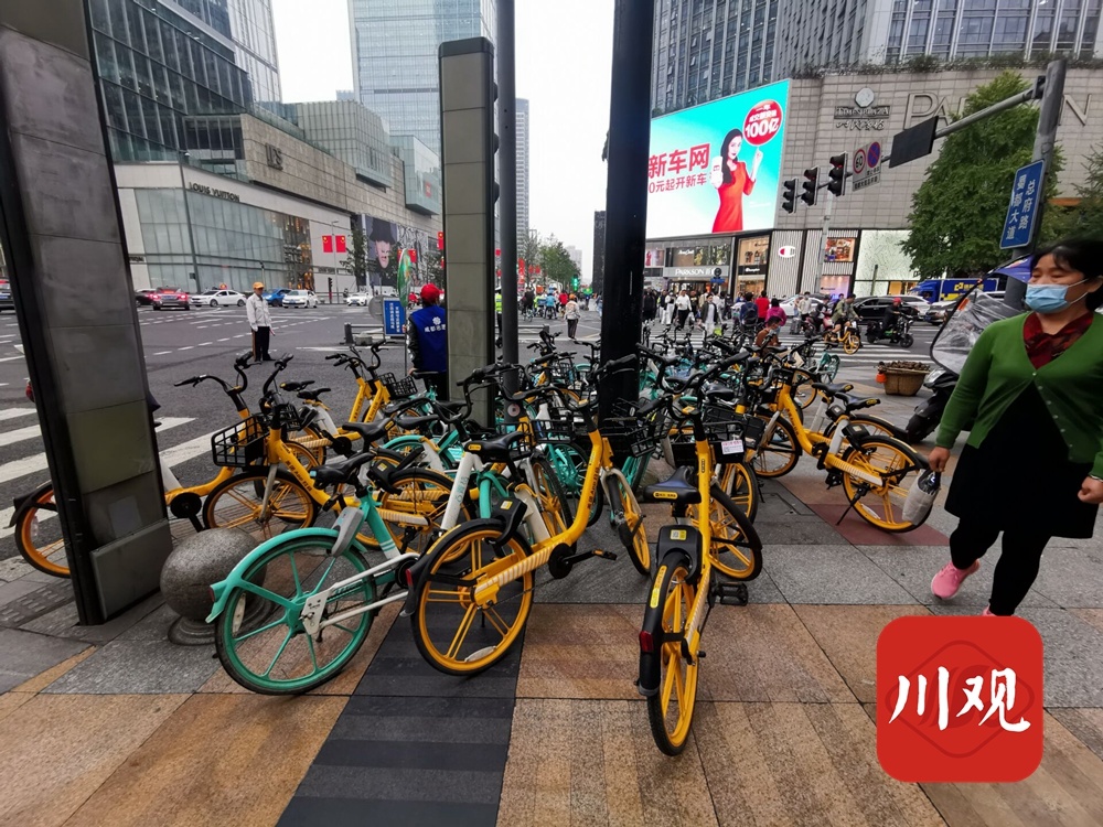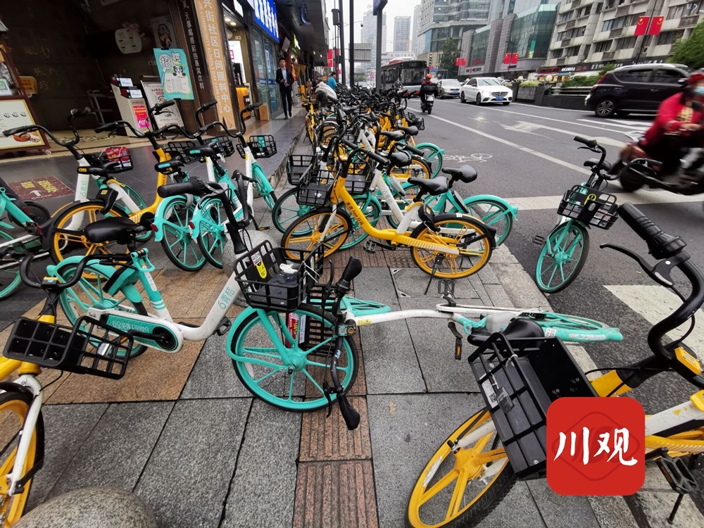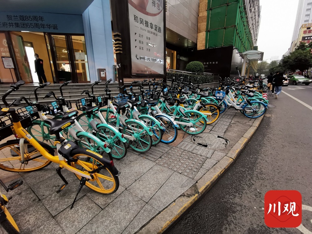 在春熙路步行街十字路口,这里的情况更为糟糕,共享单车不仅数量庞大、乱七八糟、侵占盲道,甚至连路人经过都要侧身或者绕行,有些车辆直接摆放在了快车道上……