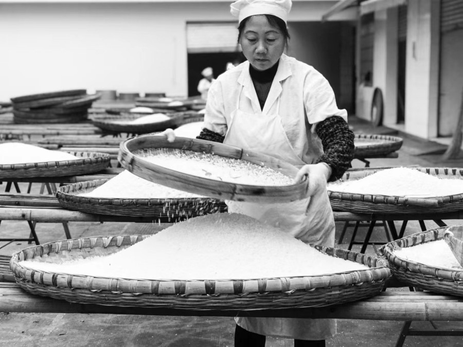 每天天一亮,张小群会将前一晚浸泡的糯米进行冲洗和蒸熟,再把蒸好的糯米进行一天的晾晒,直至将糯米中的水汽完全晒干,这时候就可以把糯米放入河沙中炒制膨化。但并不是所有膨化的糯米都可以用来制作米花糖,只有第一遍过滤出的最大颗的米粒和猪油一起翻炒制作,才能做出最正宗的苏稽香油米花糖。