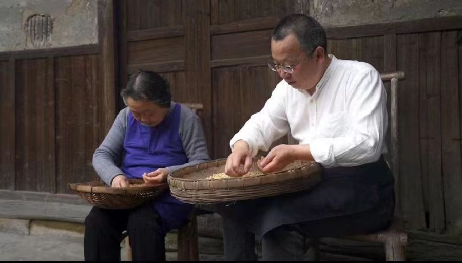 方德西坝豆腐传承人代宣轩和他的母亲邹方德挑选制作豆腐的黄豆