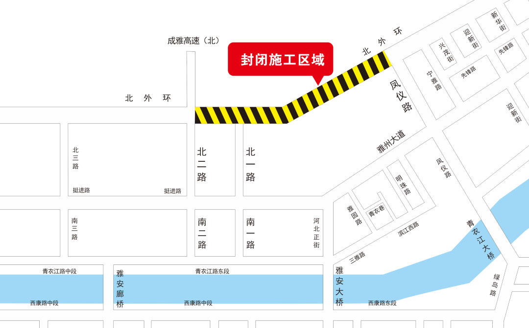 2、北环西路方向前往北环东路方向的其他机动车、非机动车,由康藏路或碧峰峡路--挺进路--雅州大道一线绕行。