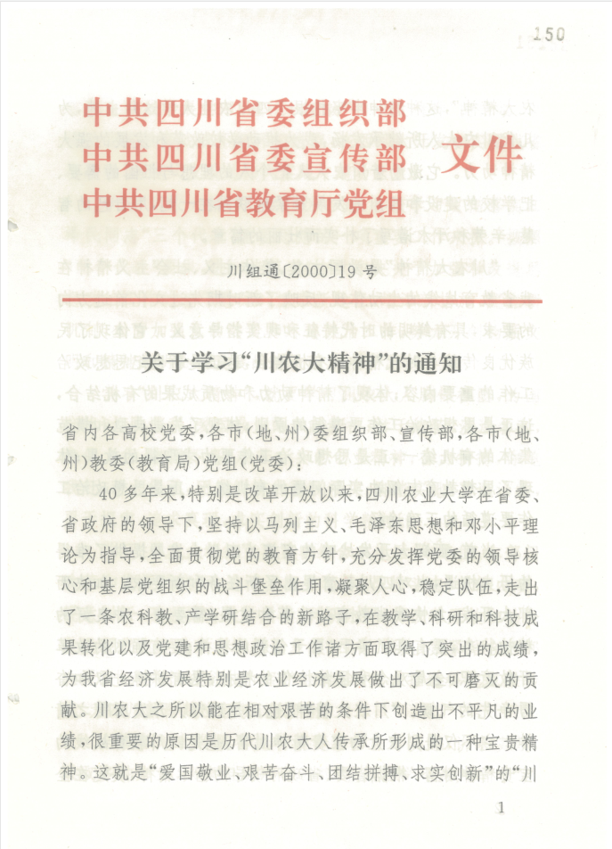 “川农大精神”的总结、宣传,不仅是川农大自身建设和发展中的一件大事,也是当时全省精神文明建设和宣传工作的重要内容。2000年5月,四川省委、省政府领导对总结、宣传“川农大精神”作出重要批示,指出:“川农大精神具有典型的先进性,宣传川农大精神对深化高校改革,加强高校工作,具有十分重要的现实意义”“精神感人、值得宣传”;7月5日,省委组织部、宣传部和省教育厅党组发出《关于学习“川农大精神”的通知》(川组通〔2000〕19号),号召全省教育战线学习和弘扬“川农大精神”。此后,“川农大精神”也得到了党和国家领导人的高度评价。