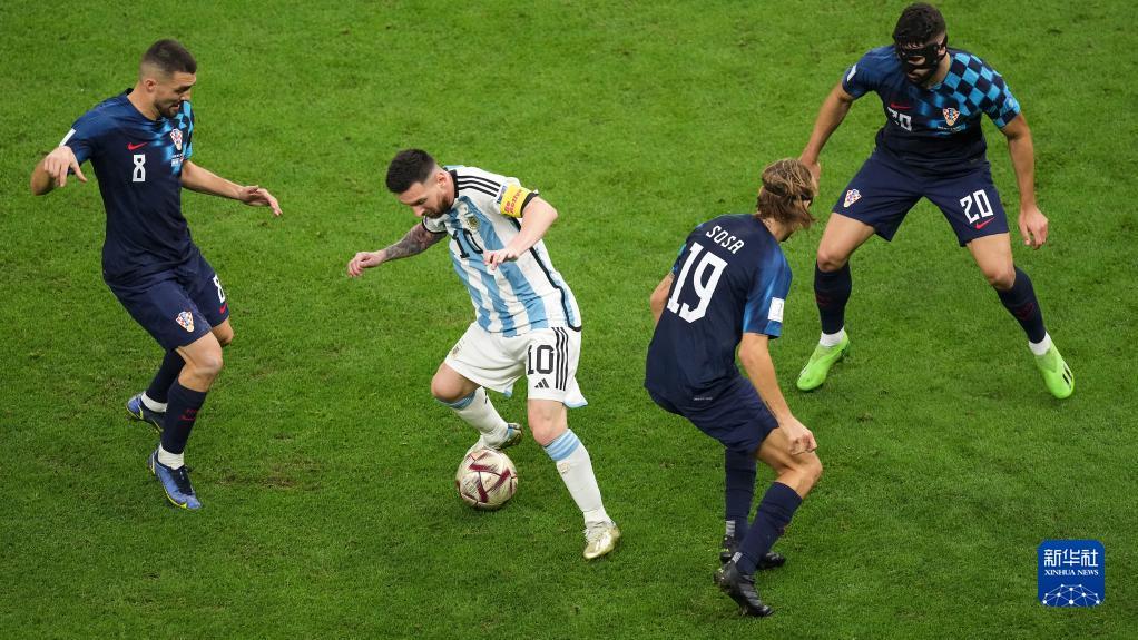 12月13日,阿根廷队球员梅西(左二)在比赛中拼抢。新华社记者 潘昱龙 摄