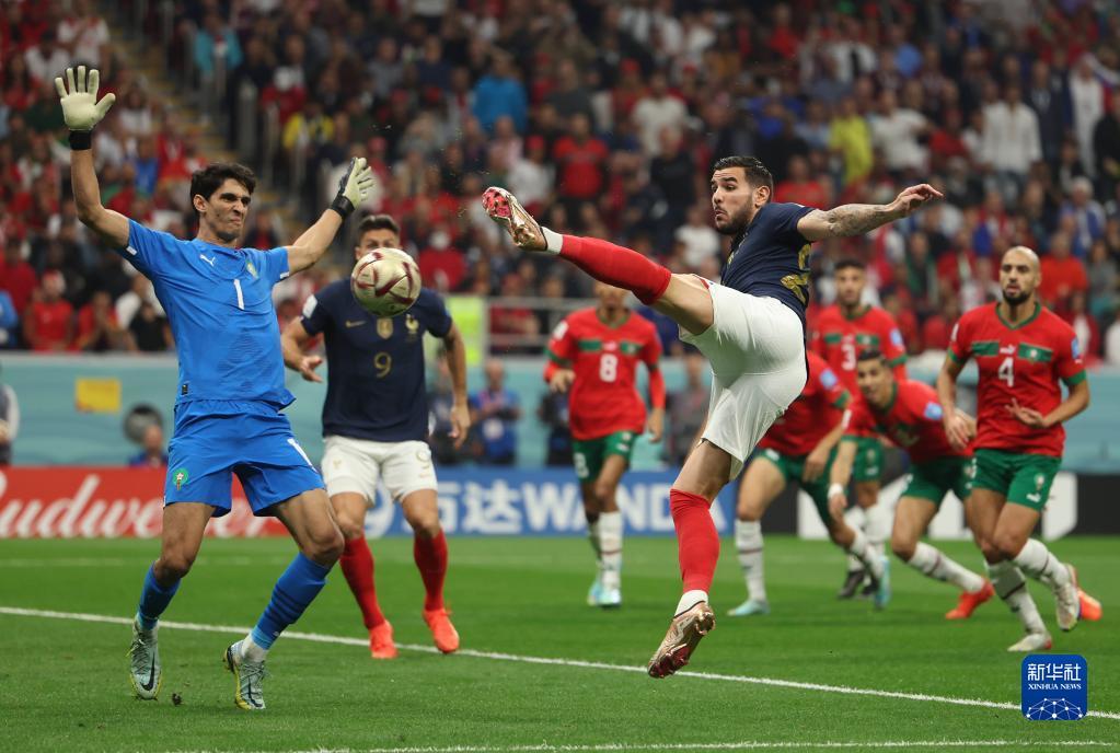 12月14日,法国队球员特奥(前右)在比赛中射门得分。新华社记者 潘昱龙 摄