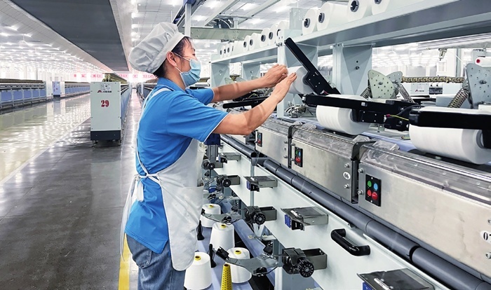 来到宜宾天之华纺织科技有限公司,上万平方米的车间明亮整洁,上百台机器整齐排开、高速运转,一袋袋盘成卷的原料棉条从这头自动“喂入”,一锭锭成品纱线在另一头自动“吐出”。公司现场负责人侯春春介绍,车间里的机器都是目前世界上最先进的涡流纺织机,产品销往全国。