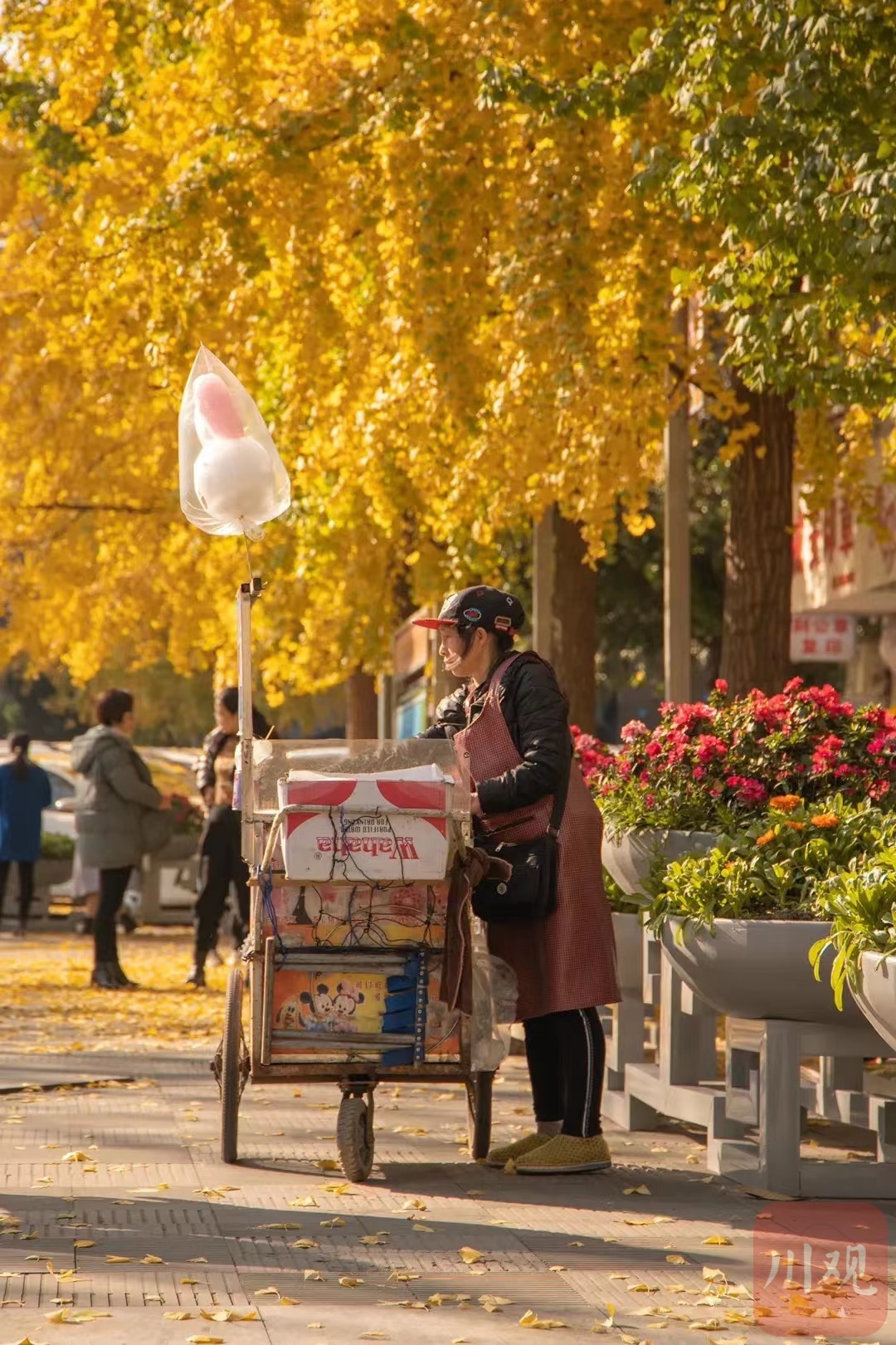 双手捧起银杏叶,向空中抛起,再用手机抓拍下这最美的一瞬间......在合江街中国宜宾长江地标广场,拍照打卡的年轻人,玩着银杏叶的小朋友,糖葫芦、桂圆藕粉等小吃摊,还有坐着聊天的老年人构成了一幅和谐、悠闲的冬日景象。