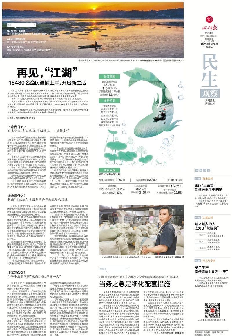 去年6月,《四川省长江流域重点水域禁捕和建立补偿制度实施方案》出台,我省长江流域重点水域实施禁捕,渔民退捕转产涉及全省18个市(州)、115个县(市、区)。截至9月28日,全省已完成退捕渔船10257艘、退捕渔民16480人;实现转产转业11403人,占有劳动能力和就业意愿人数的92.5%。