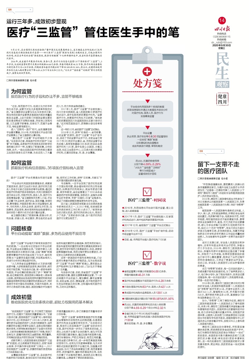 9月12日,在全国深化医改经验推广暨中国卫生发展高峰会上,省卫健委主任何延政以《运用现代信息技术精准推进医疗监管——四川医疗“三监管”探索与实践》为题在大会分享,引来全国同行的共鸣。就在去年底的全国“推进医改,服务百姓健康”十大新举措评选中,我省的医疗监管措施名列其中。
