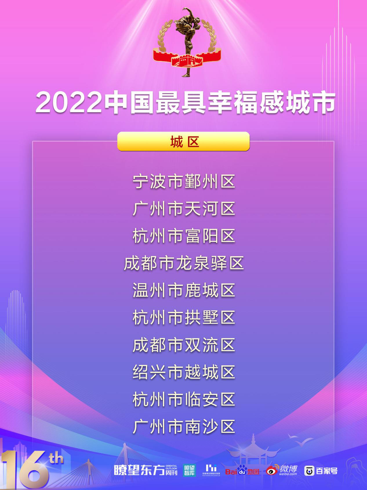 12月21日,2022中国幸福城市论坛在浙江杭州举行,发布了“2022中国最具幸福感城市”调查推选结果,成都市龙泉驿区首次上榜,获得“2022中国最具幸福感城区”称号,在中西部所有城区中位列首位。