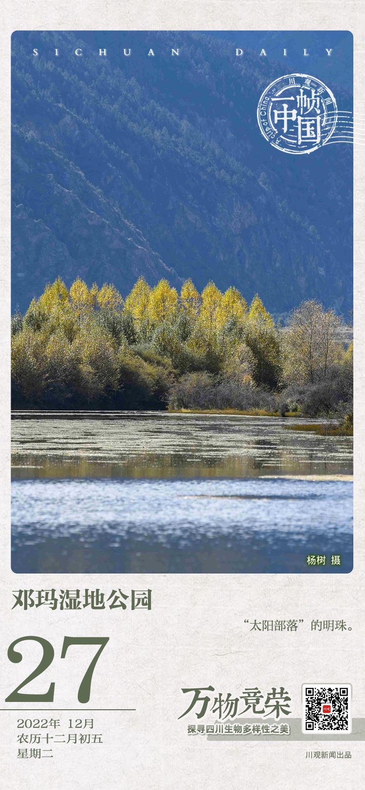 邓玛湿地公园是典型的青藏高原高寒湿地,这里既有高原的广阔无垠,又有江南的温婉诗意。公园内栖息着成千上万的野生动物,堪称生物多样性的“基因宝库”。春夏时节,这里野花遍布,牛羊成群,常能看到赤麻鸭、斑头雁等鸟类栖息于江滩。公园还拥有甘孜州面积最大的人工沙棘林,到了秋天,万亩野生沙棘林金黄一片,金黄色的果实挂满枝头,在碧水蓝天下,绵延成一道亮丽的风景线,颇为壮观。