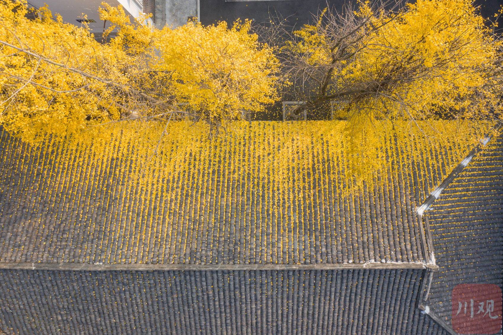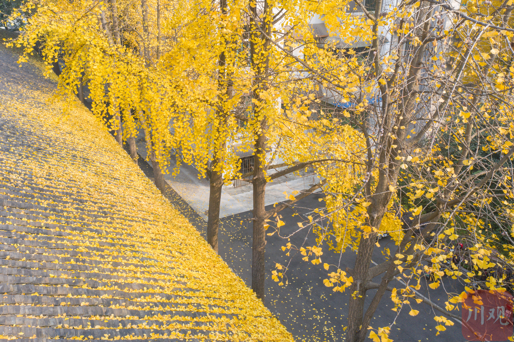 12月23日,眉山市彭山区城区道路两旁以及部分小区里,高大的银杏树上挂满金黄色的银杏叶。随微风飘落的树叶将路面铺成油画一般的金色地毯,让人心醉。