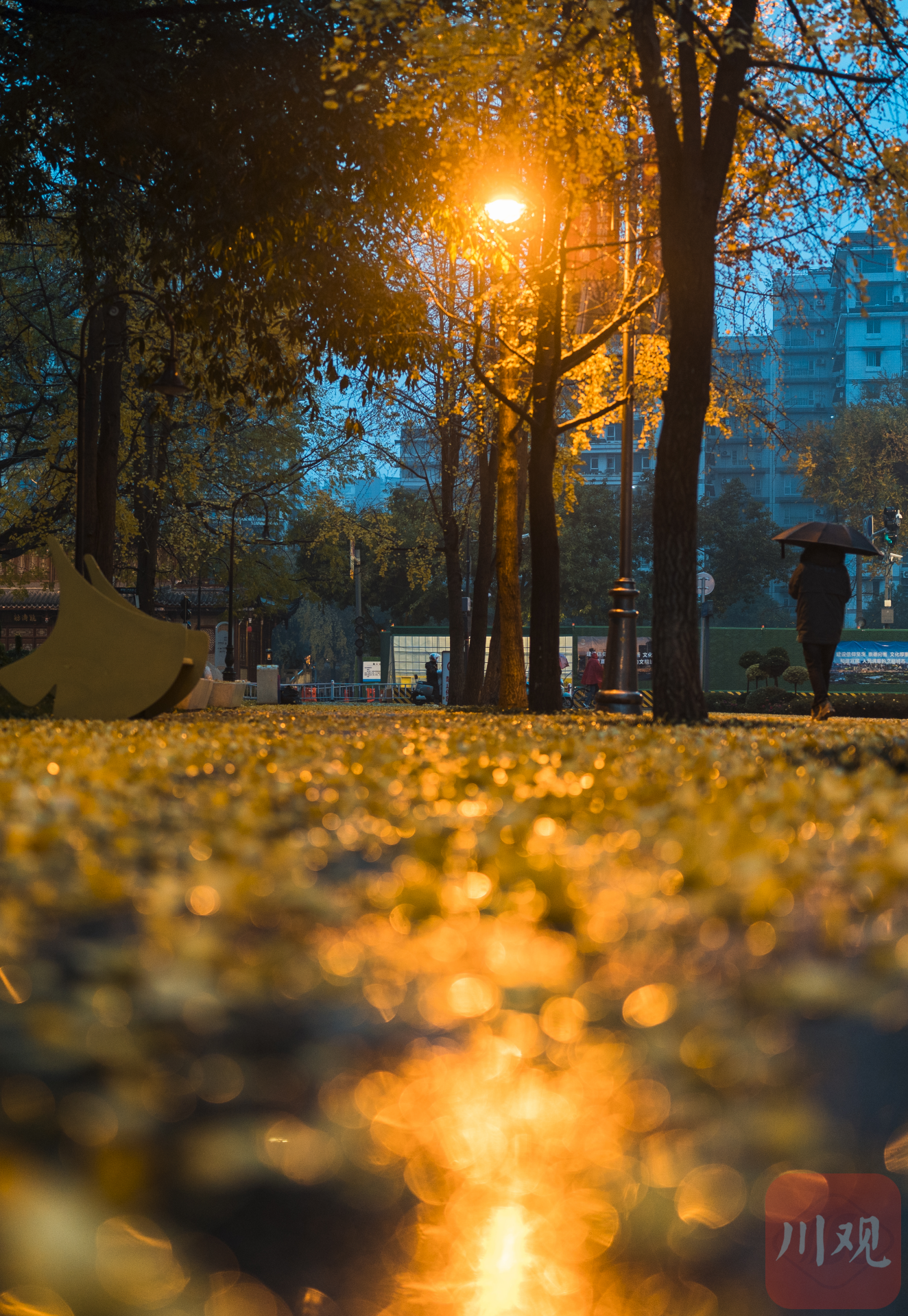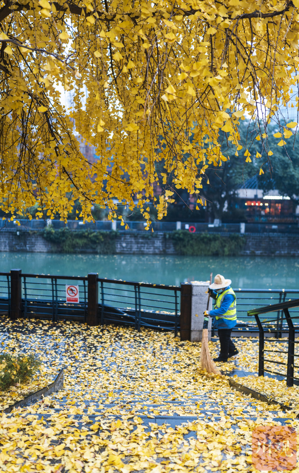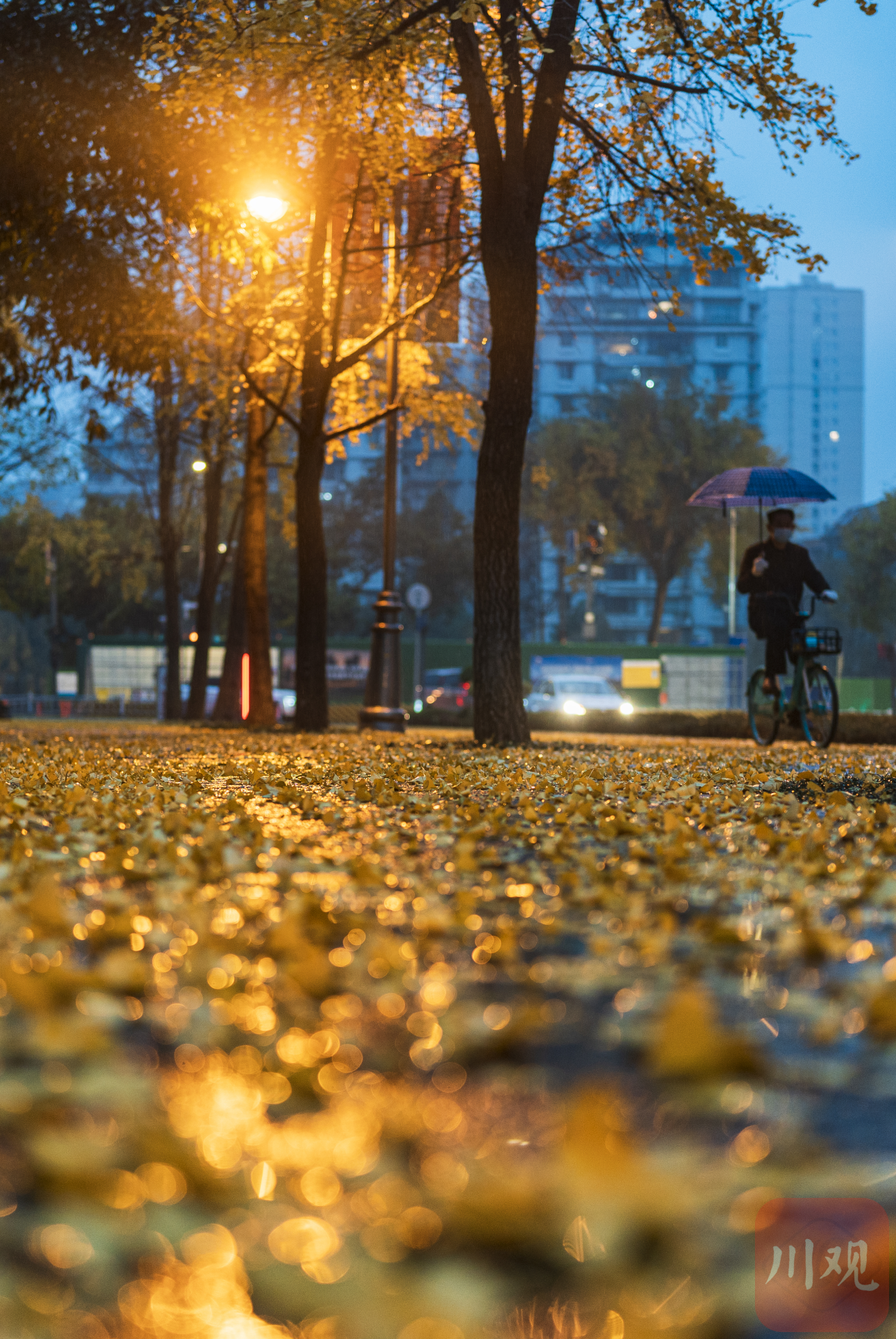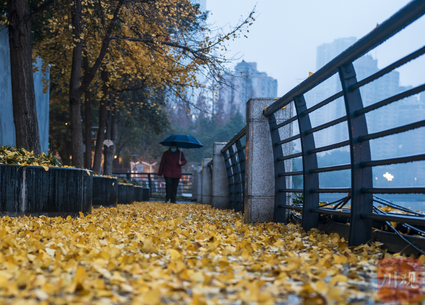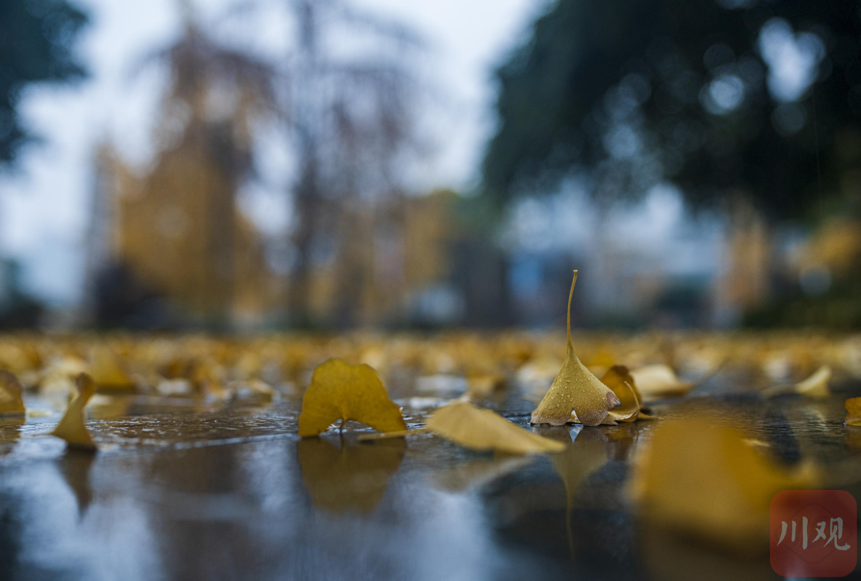 12月25日,成都市区迎来降温天气,冷天气再度回归。冷风吹过,银杏树叶纷纷从树上飘落,宛如金色蝴蝶在空中漫天飞舞,将道路铺得满地金黄。