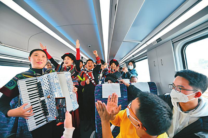 凉山群众在动车车厢内载歌载舞,欢庆动车开进凉山。