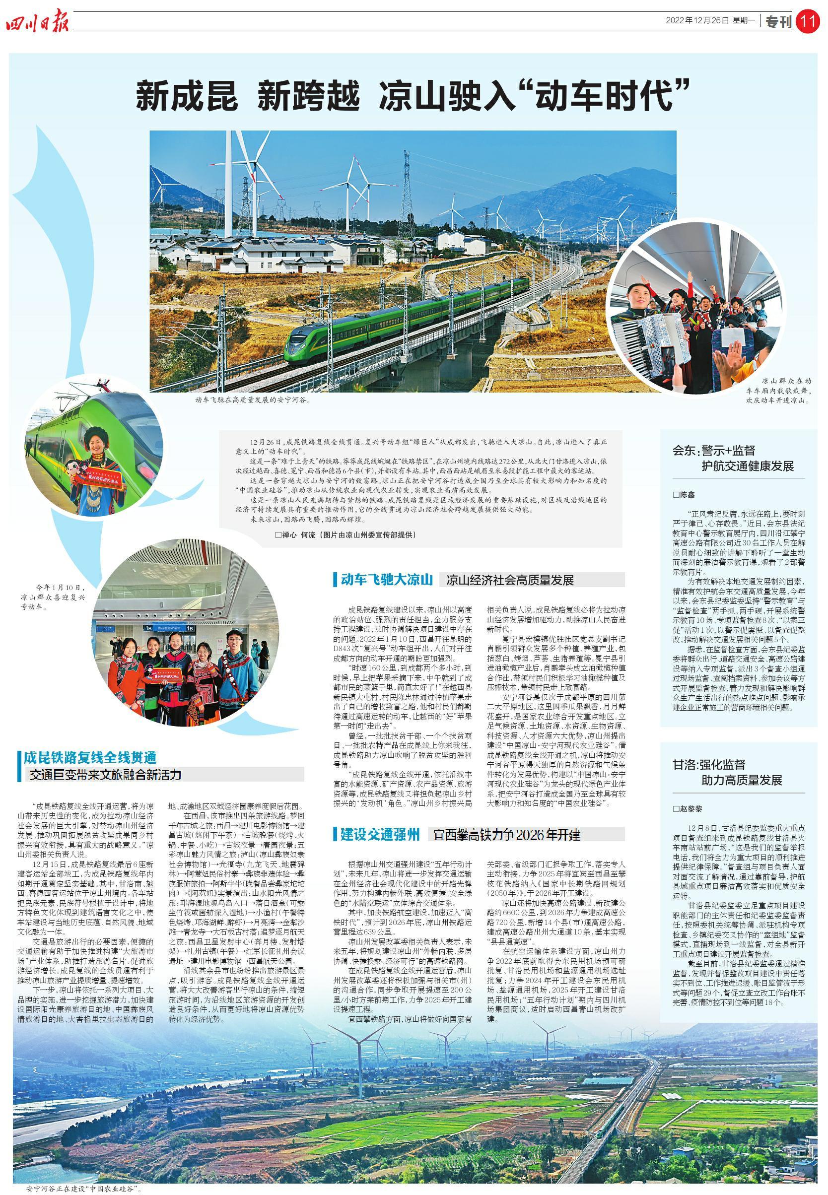 12月26日,成昆铁路复线全线贯通。复兴号动车组“绿巨人”从成都发出,飞驰进入大凉山。自此,凉山进入了真正意义上的“动车时代”。当天,四川日报刊发整版文章,从交通变迁、文旅发展、经济高质量发展等角度,梳理出复线全线贯通对凉山带来的重要意义。