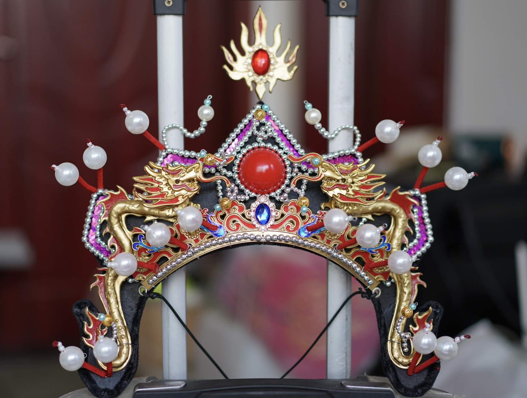 在工作台上,摆放着陈胜正在制作的一个头帽,色泽艳丽、造型精美。“这叫独独冠,可用于川剧独特的丑行类别龙箭丑角色、或者权豪之家的青少年人。头帽的灵活性很强,可以随意拆装,如果加上别的道具,就可以用于诸侯王等角色。”陈胜说。