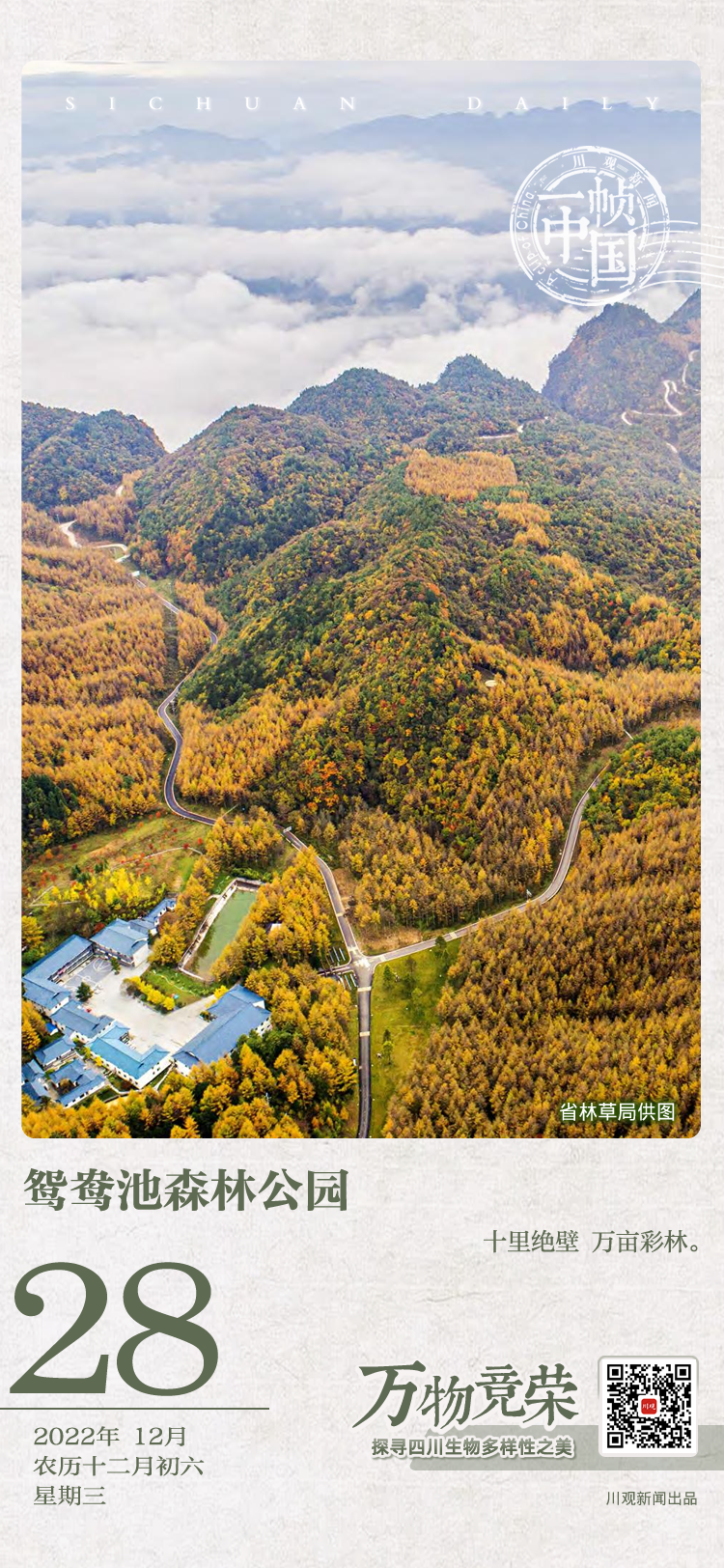 曾家山鸳鸯池森林公园位于广元市朝天区李家镇,公园拥有川北独有的金色针阔叶彩林景观、连绵15公里的喀斯特绝壁地貌景观、中山日出与云海景观,山上有两个人工湖,湖水浩淼,景色旖旎,人称鸳鸯池,是国家4A级旅游景区。