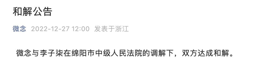 12月27日,MCN机构杭州微念发布消息称,微念与李子柒在绵阳市中级人民法院的调解下,双方达成和解,长达一年多的纷争告一段落。
