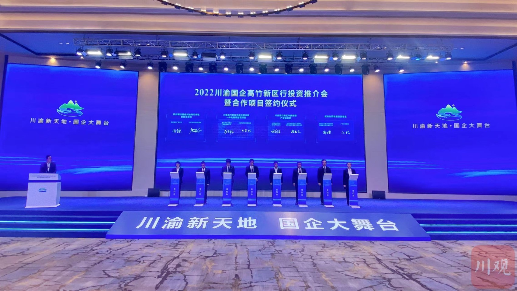更多力量正在汇聚,在当天举行的2022川渝国企高竹新区行活动中,川渝国资国企与广安市、重庆市渝北区、川渝高竹新区集中签署合作协议34个,投资额近1080亿元。