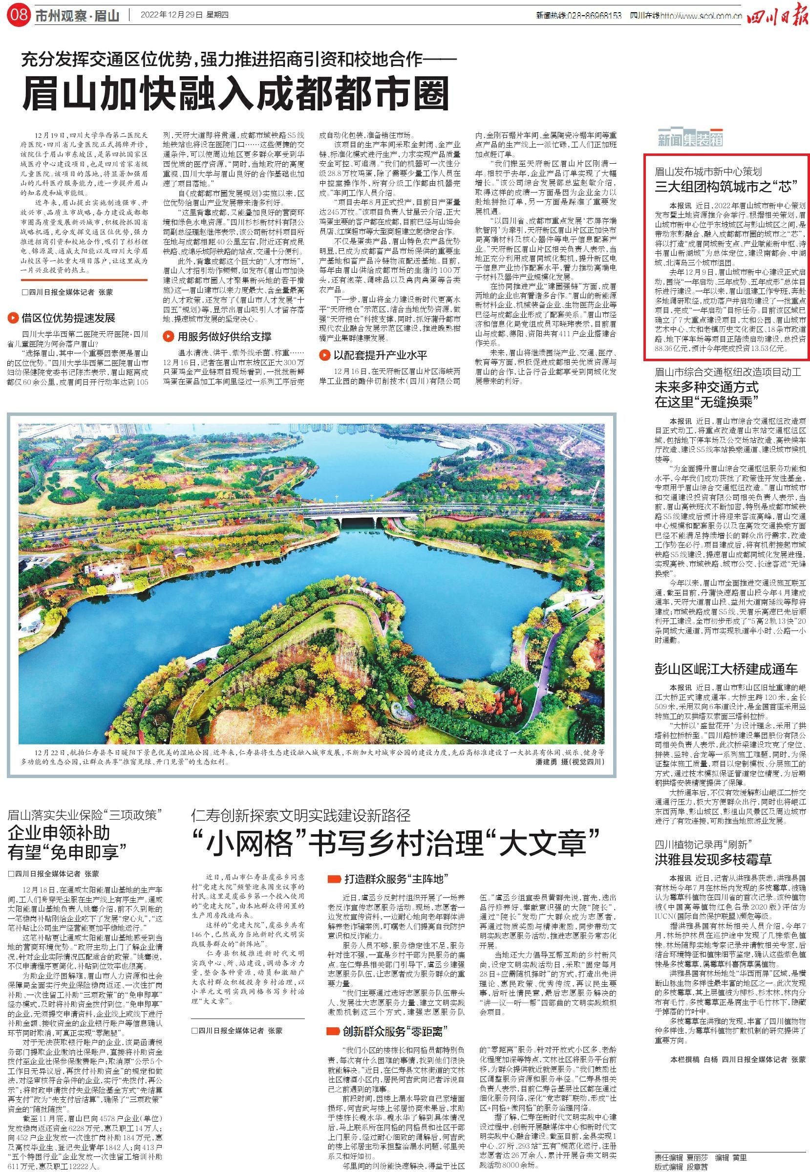 去年12月9日,眉山城市新中心建设正式启动,围绕“一年启动、三年成势、五年成形”总体目标进行建设。一年以来,眉山组建工作专班,奔赴多地调研取经,成功落户并启动建设了一批重点项目,完成“一年启动”目标任务。目前该区域已确立了7大重点建设项目,太和公园、眉山城市艺术中心、太和老镇历史文化街区、18条市政道路、地下停车场等项目正陆续启动建设,总投资88.36亿元,预计今年完成投资13.53亿元。