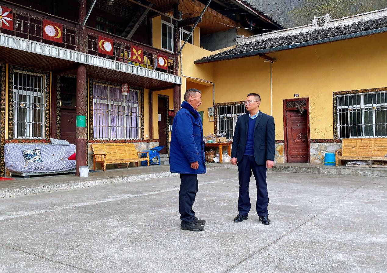 邮储银行泸定县支行行长田富强(右)正与燕子沟镇的养殖大户苟富安(左)交流。