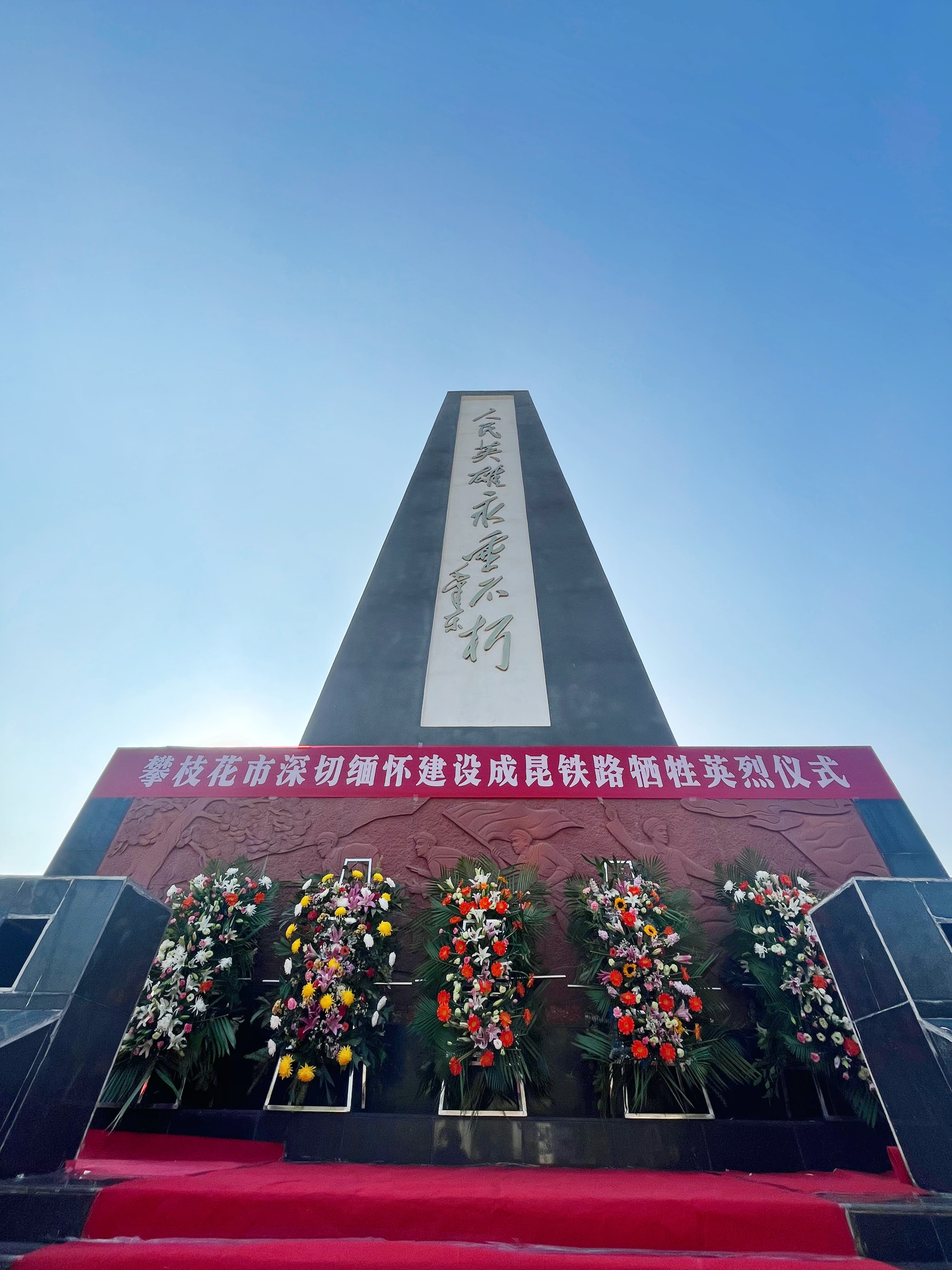 当天下午,因降温而阴霾的天气突然转晴,攀枝花市盐边县烈士陵园内,烈士纪念碑巍然屹立,碑身正面,“人民英雄永垂不朽”八个大字苍劲有力,在阳光下熠熠生辉。纪念碑后的墓园内松柏苍翠,草木葱茏,显得分外庄严肃穆。攀枝花市领导、盐边县政府相关部门负责人及社会各界群众代表共百余人,面向纪念碑,整齐排列,庄严肃立。