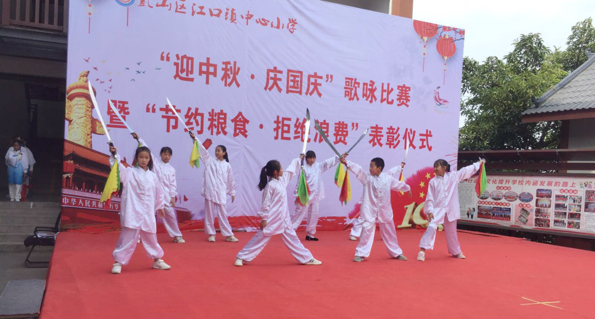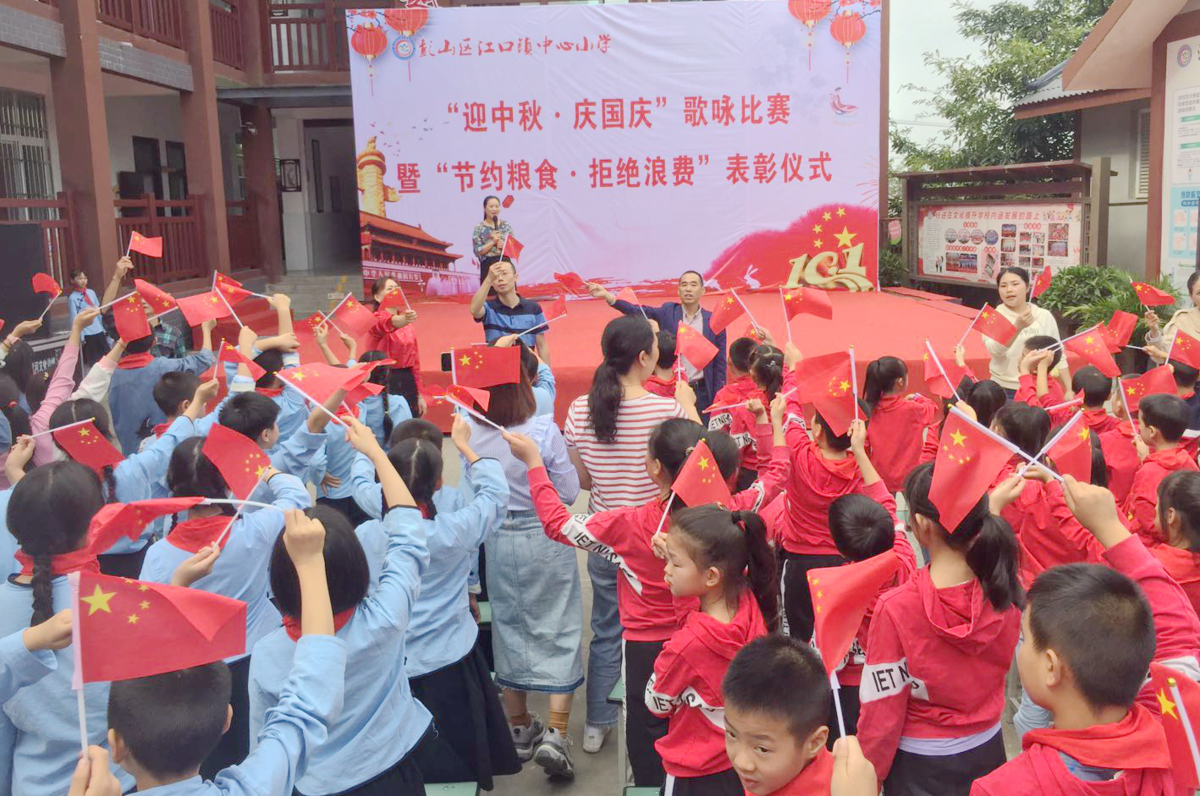 9月30日,眉山市彭山区江口镇中心小学举办“迎中秋、庆国庆”歌咏比赛暨“节约粮食、拒绝浪费”先进表彰活动,全校师生参加活动。