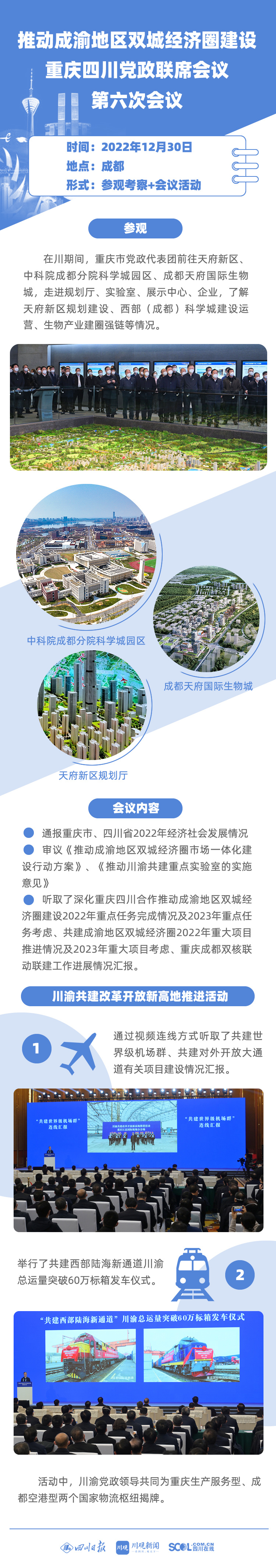 12月30日,推动成渝地区双城经济圈建设重庆四川党政联席会议第六次会议在成都召开。会议有哪些议程,取得了什么成果?一图了解↓