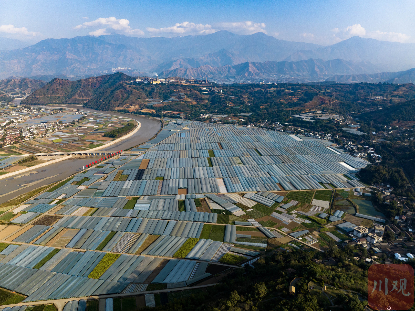 航拍安宁河畔的攀枝花米易县10万亩稻菜轮作基地核心区。