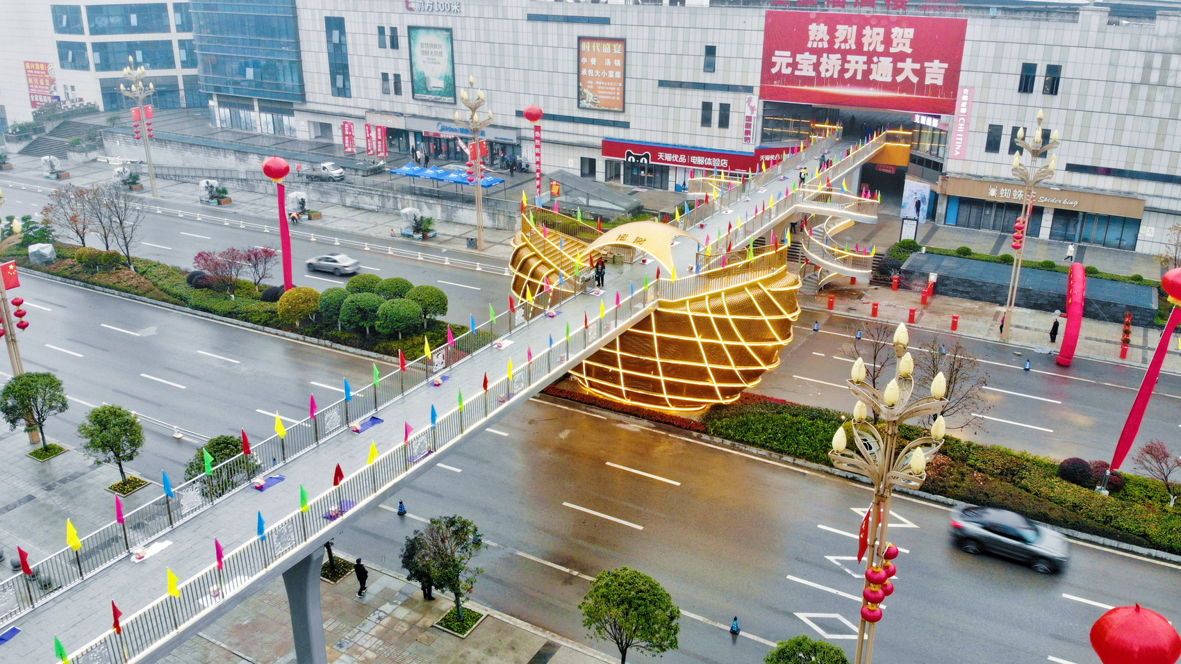 元宝桥横跨新华大道,天桥中间由一个巨大的金元宝造型建筑支撑,金元宝顶端刻有“招财进宝”四个大字,两侧还设置了阶梯观景台,供群众俯瞰城市风光。当夜幕降临,整座桥被灯光点亮,其中“金元宝”的金色彩灯分外吸睛。