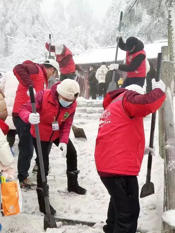 此外, 景区交通部门每日凌晨组织铲雪车辆,进行道路除雪保畅通,峨眉山景区金顶管理处每日组织工作人员做好步游道的铲冰除雪,景区报国管理处对片区200余家酒店、民宿进行包干负责,分片区负责安全、服务等。
