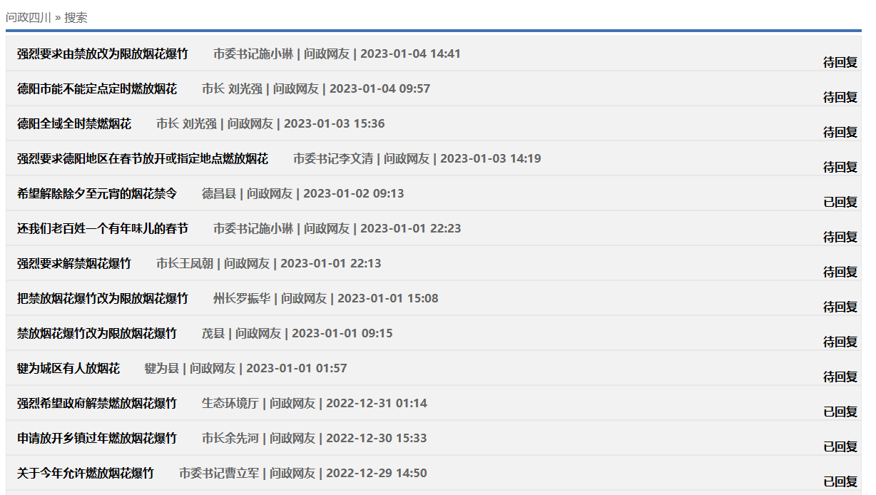 问政四川平台网友关于烟花燃放的部分咨询留言。