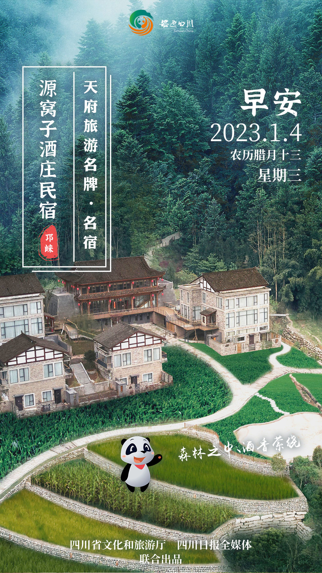 1月4日,星期三。今日天府旅游名牌日历海报走进天府旅游名宿——邛崃市源窝子酒庄民宿,感受森林之中酒香萦绕的独特韵味。