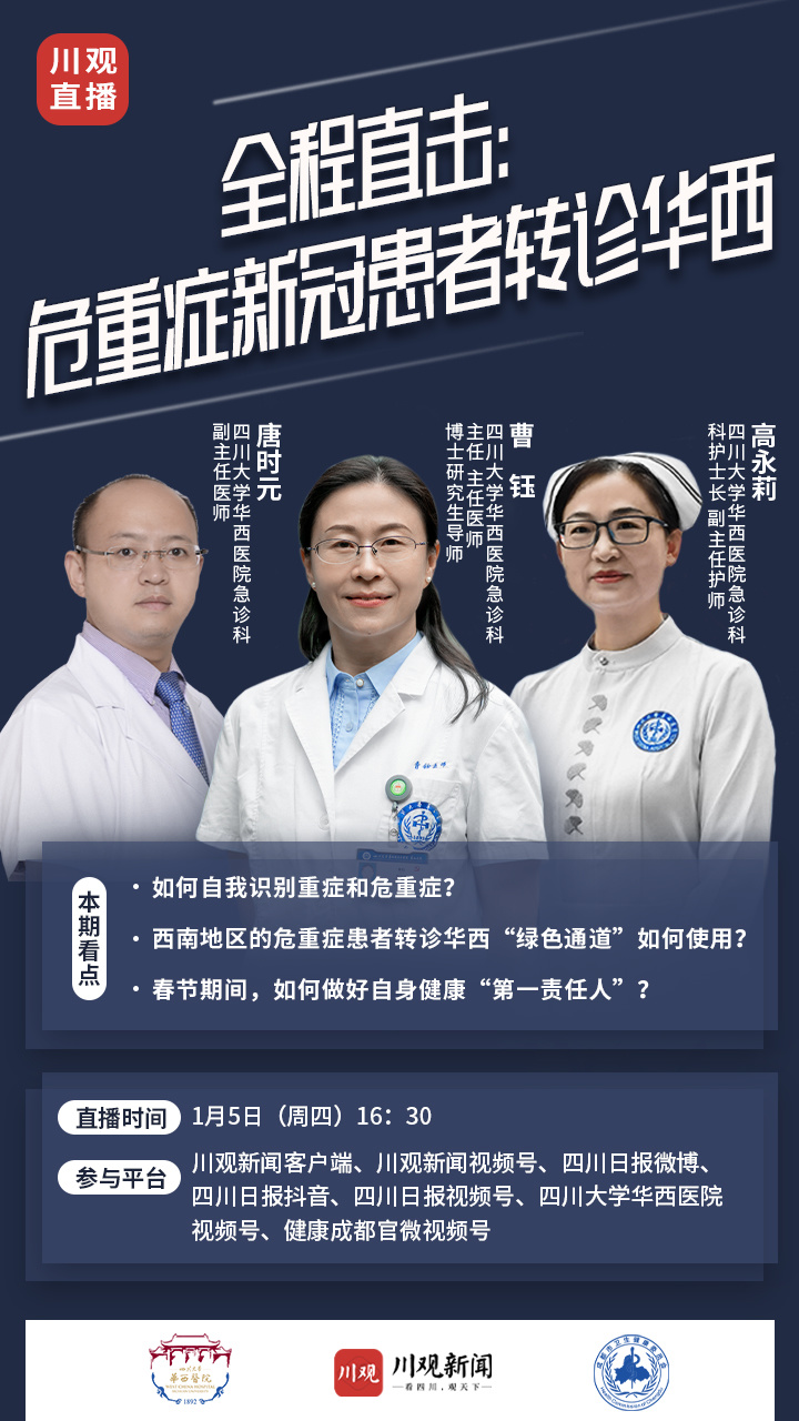 2023年1月5日,四川大学华西医院急诊科、川观新闻春节“生命线”——重症转运“绿色通道”面向公众开通,首次联合对危重症患者通过华西医院“危重症院间转诊预约平台”转运过程进行直播。