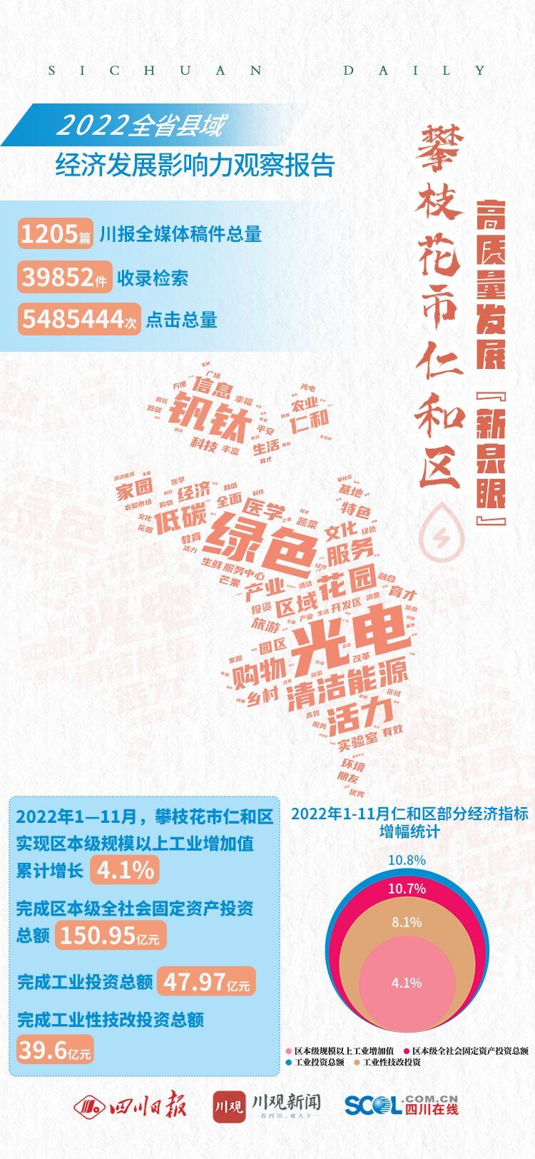 日前,川观新闻发布《2022年全省县域经济发展影响力观察报告·攀枝花市仁和区》,通过川报全媒体后台大数据统计,一年来,川报全媒体共刊发仁和区相关稿件1205篇,收录检索39852件,点击总量达5485444次。梳理全年川报全媒体对仁和区的相关报道发现,“钒钛”“绿色低碳”“清洁能源”“光电”等成为高频关键词。