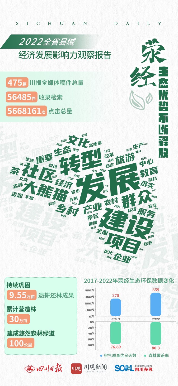日前,川观新闻推出《2022全省县域经济发展影响力观察报告·雅安市荥经县》,通过川报全媒体后台大数据统计,过去一年,川报全媒体共刊发荥经县稿件475篇,收录检索56485件,点击总量达5668161次。梳理这一年川报全媒体对荥经县的相关报道显示,“发展”“转型”“建设”“大熊猫”等成为高频关键词。