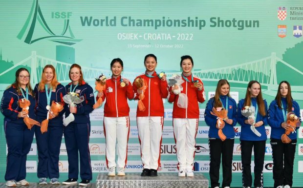 2022年国际射联飞碟射击世锦赛,在飞碟双向青年组女子团体决赛中,王丹与周瑶佳、王英子组成的中国队斩获金牌。四川省陆上运动学校供图