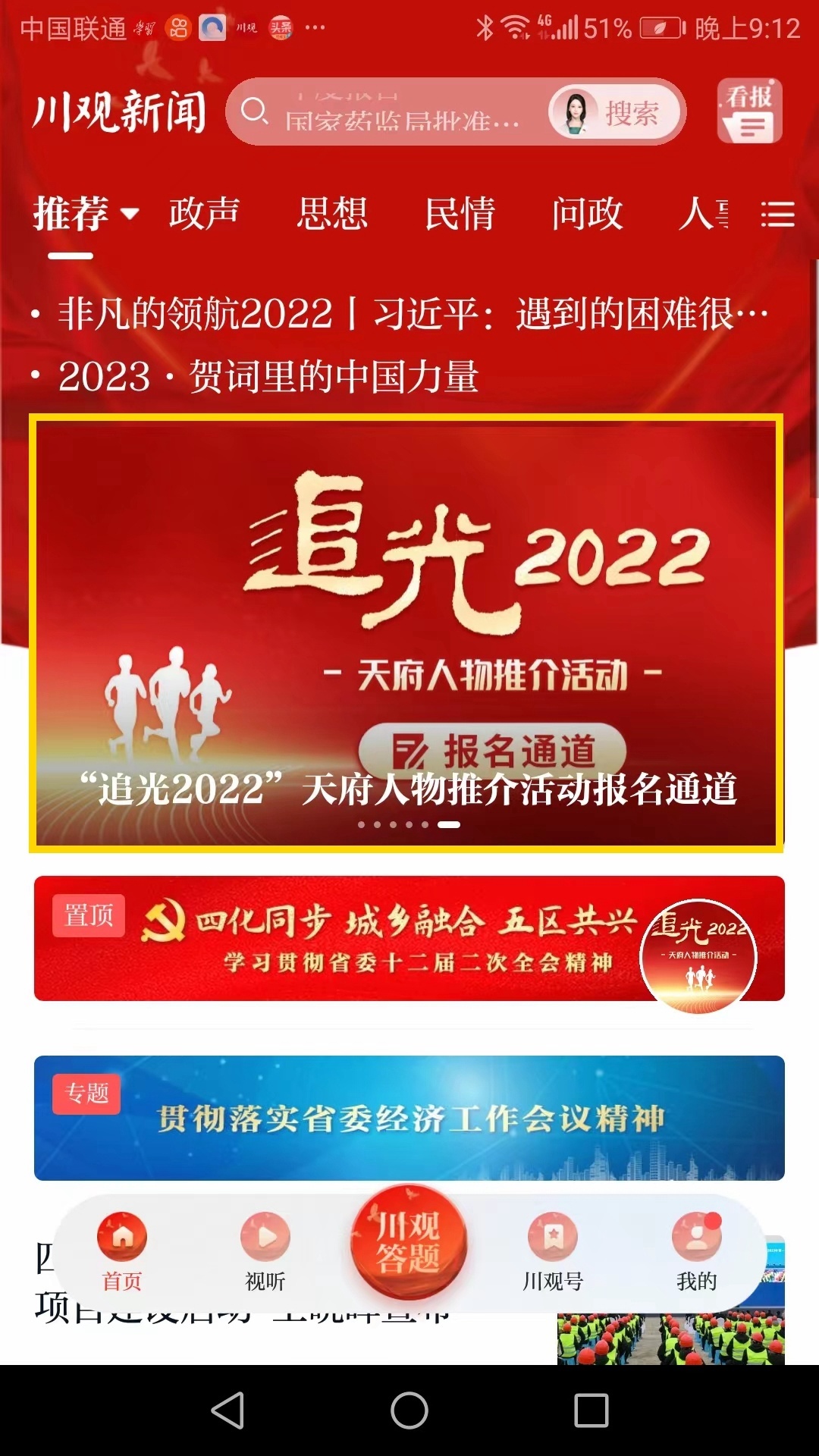 1、登录川观新闻客户端,点击上方“追光2022”天府人物推介活动报名通道,或点击右侧悬浮球进入报名通道。