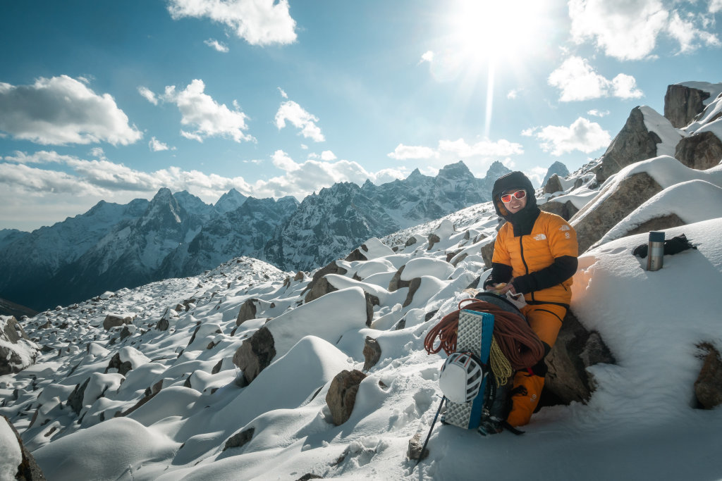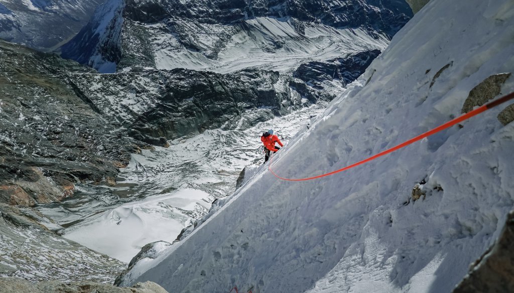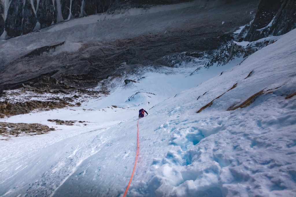 2021年12月底,适合攀登的天气周期终于来到。12月3日,攀登开始。每一步都必须慎重对待。坡度接近80度,脚掌摸索可以着地的位置,陈楚俊有时甚至只能踩在岩石的棱角上。第一天的行程,已经让他们见识到幺妹峰的无情。在这条1200米的线路上,没有足够的地方可以让他们搭建稳固的帐篷。他们寻找能躺下的狭小空间,套着睡袋露天休息,睫毛处常常挂着冰花。
