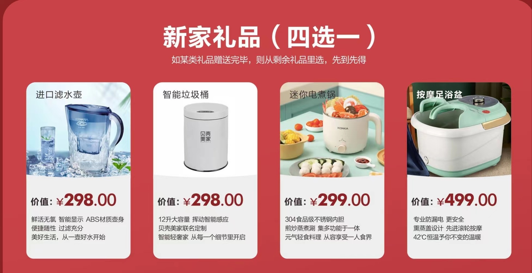 成都贝壳美家整装体验馆新家礼品(“进口滤水壶、智能垃圾桶、迷你电煮锅、按摩足浴盆”四选一,如某类礼品赠送完毕,则从剩余礼品中选,先到先得)