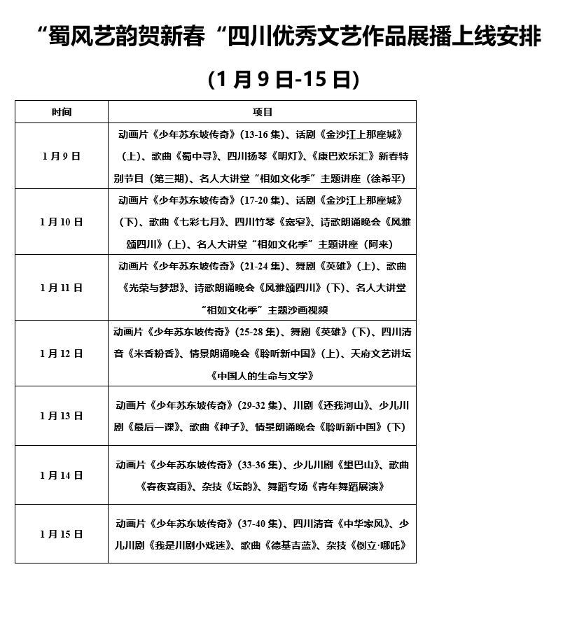 本次“蜀风艺韵贺新春”四川优秀文艺作品展播更新的作品,从即日起播放至1月15日。在工作日,我们依然为小朋友安排了可爱的动画片《少年苏东坡传奇》,同样充满了浓浓的中国风韵味,讲述的是生活在眉山的“小时候苏东坡”。