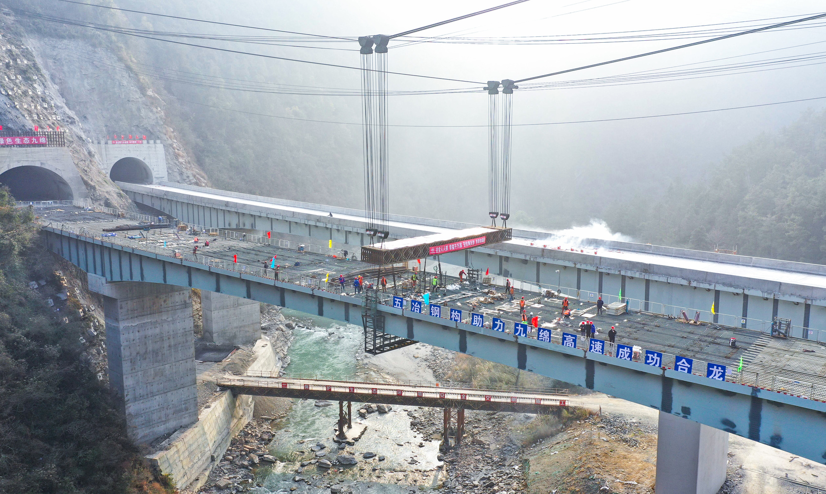 1月10日上午,随着最后一块钢箱梁安装就位,九绵高速桂溪大桥主体钢箱梁全幅顺利合龙,这也是全国首例应用缆索吊装悬拼安装工艺的山区公路钢箱梁大桥。