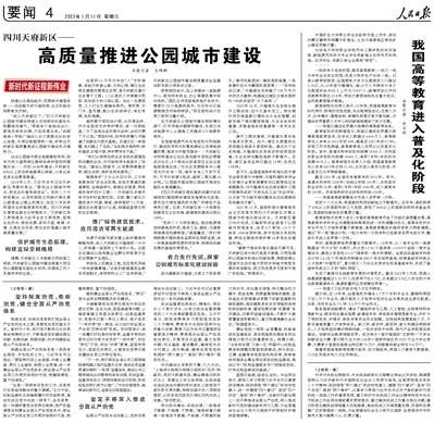 今日(1月11日)出版的《人民日报》在第4版“新时代新征程新伟业”专栏中以《四川天府新区——高质量推进公园城市建设》为题,报道了四川天府新区坚持生态优先、绿色发展,高质量推进公园城市建设。