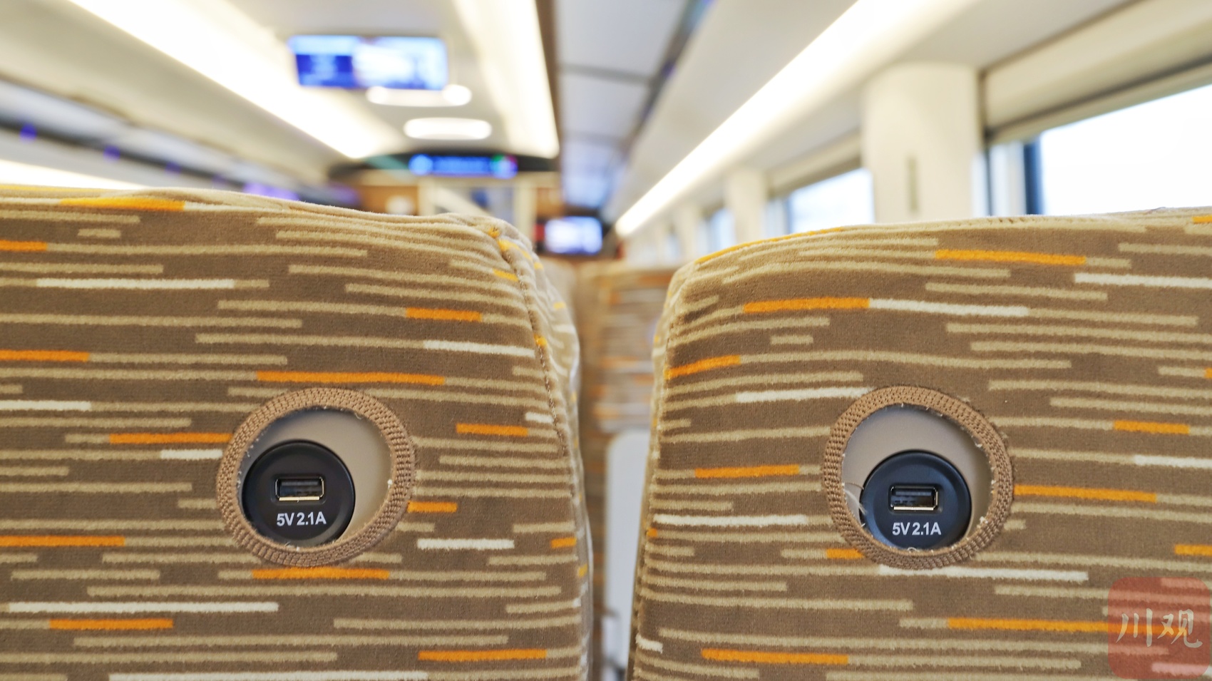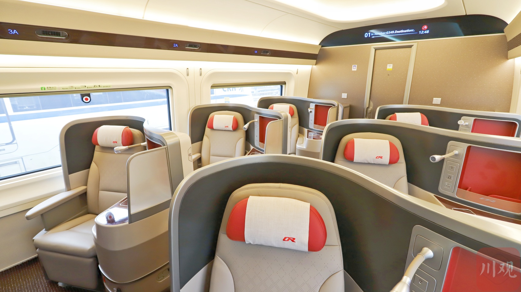 与标准版复兴号动车组相比,新动车组设备设施更加完善,车厢所有座椅均基于人体工程学进行优化,一等座增加电动腿靠、头枕调节行程等功能,在中间扶手处设置双USB口插座;二等座靠背增加USB接口,方便旅客充电,并优化了小桌板设计。值得一提的是,该车型商务座采用“鱼骨式”布局方案,不但提高了旅客私密性、便捷性、舒适性,还带有手机投屏功能的智能交互终端,可为旅客提供丰富的娱乐节目、运行信息等贴心服务。
