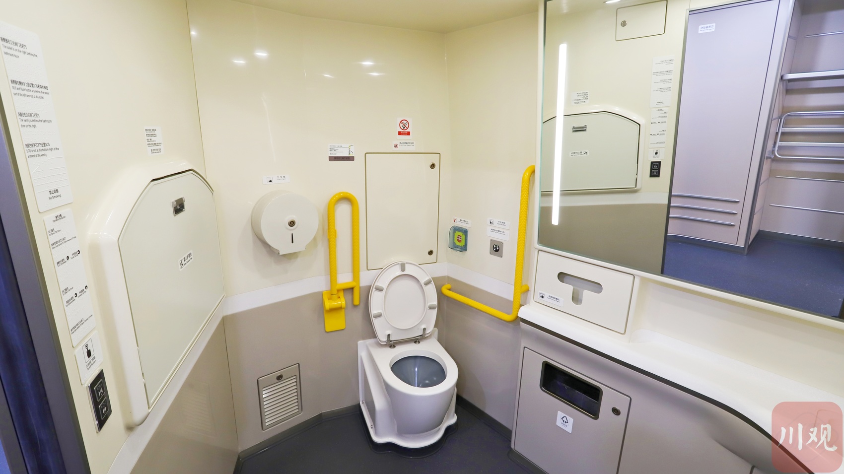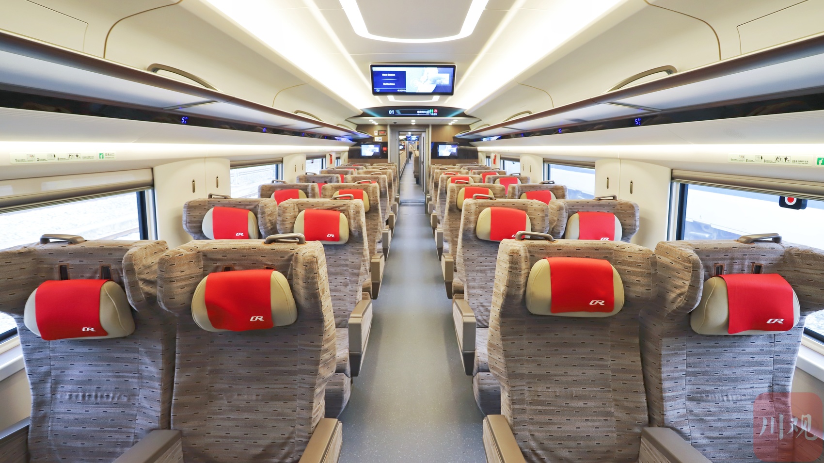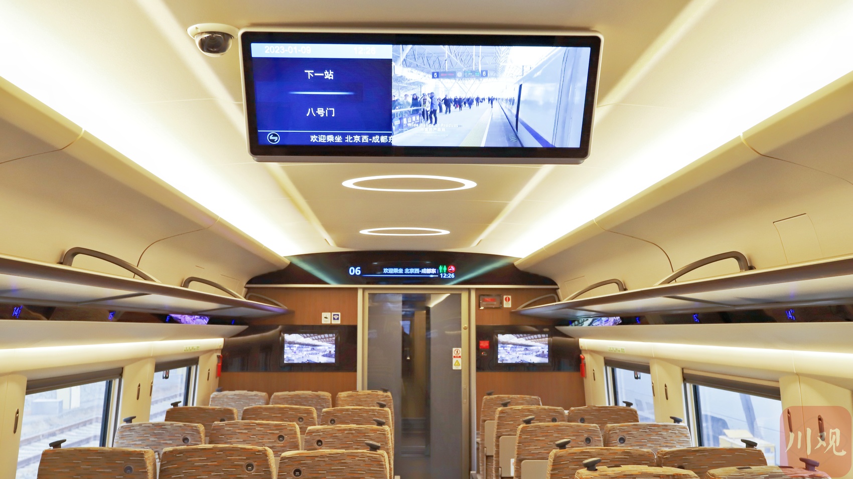 此外,该型复兴号智能动车组采用变频空调、增加卫生间智能照明,在客室设置29寸LCD宽屏吊顶电视,文本和视频分屏显示,左侧显示车辆运行信息,右侧播放节目,显示画面更具科技感。设有无障碍车厢,增加盲文标识,配置了更宽阔的通过门、卫生间和轮椅放置区,更好服务旅客需求。