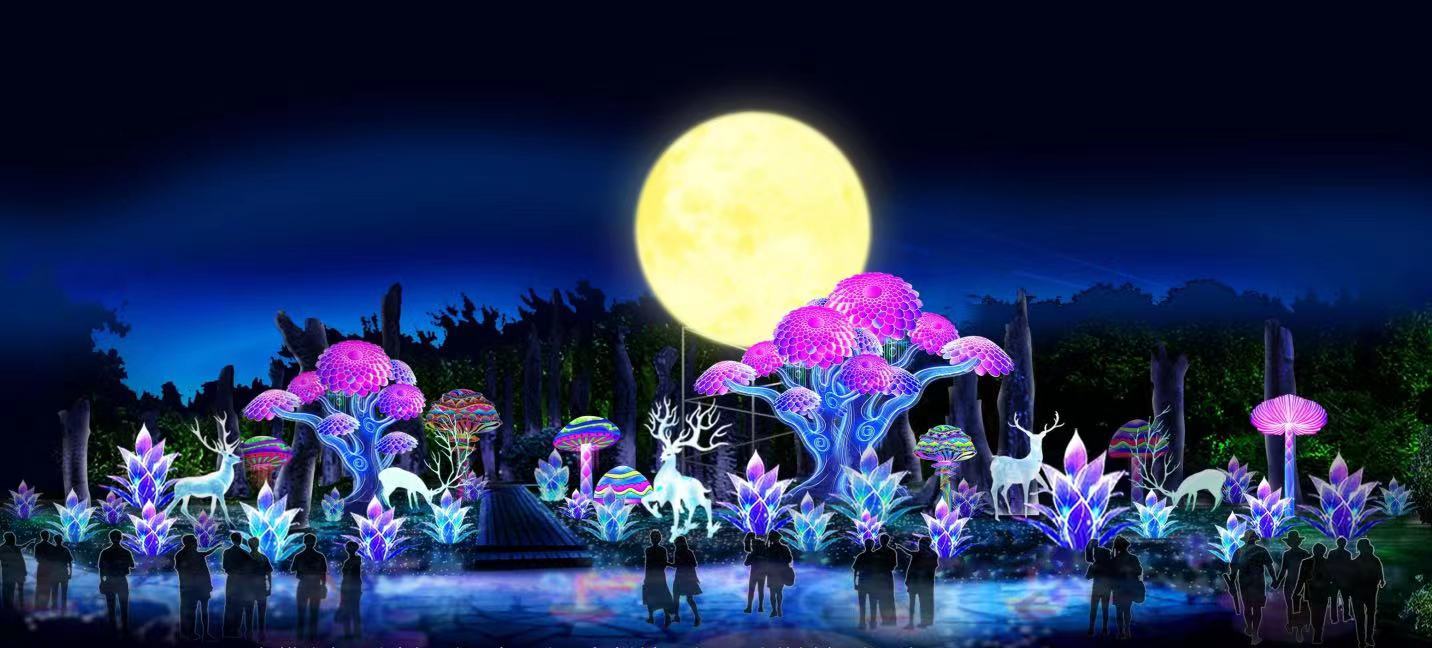 在金沙的网红打卡点乌木林,灯组设计以《山海经•海内经》中描绘的神奇事物、奇妙山水为创作灵感,将充满怪诞色彩的蘑菇树和空灵气质的仙鹿融入乌木林中。袅袅仙气中,一轮高达12米、直径6米的仿真“月球”冉冉升起,营造出“海上生明月,天涯共此时”的诗意幻境。