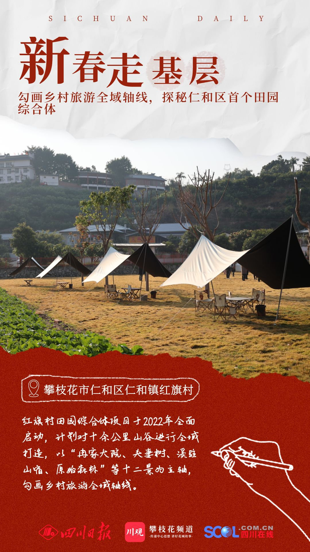 这份喜悦,溢于言表,让探访的记者一行也真切感受到。“依托当地自然生态、文化旅游资源,凸显川滇山地乡村特色,打造全产品体系乡村旅游聚集地。”同行的仁和镇人大主席、红旗村第一书记王羽说,该项目于2022年全面启动,计划从红旗村一组至三组沿路而上,对十余公里山谷进行全域打造,以“冉家大院、夫妻树、溪驻山宿、原始森林”等十二景为主轴,勾画乡村旅游全域轴线。