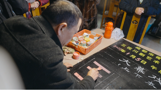 门口写“水牌”的大爷谢时辉是2019年来的,觉得三花剧团戏报上的字写得不好,便自掏腰包买了颜料,开始为三花剧团免费写起了戏报,这一写就是两年多。