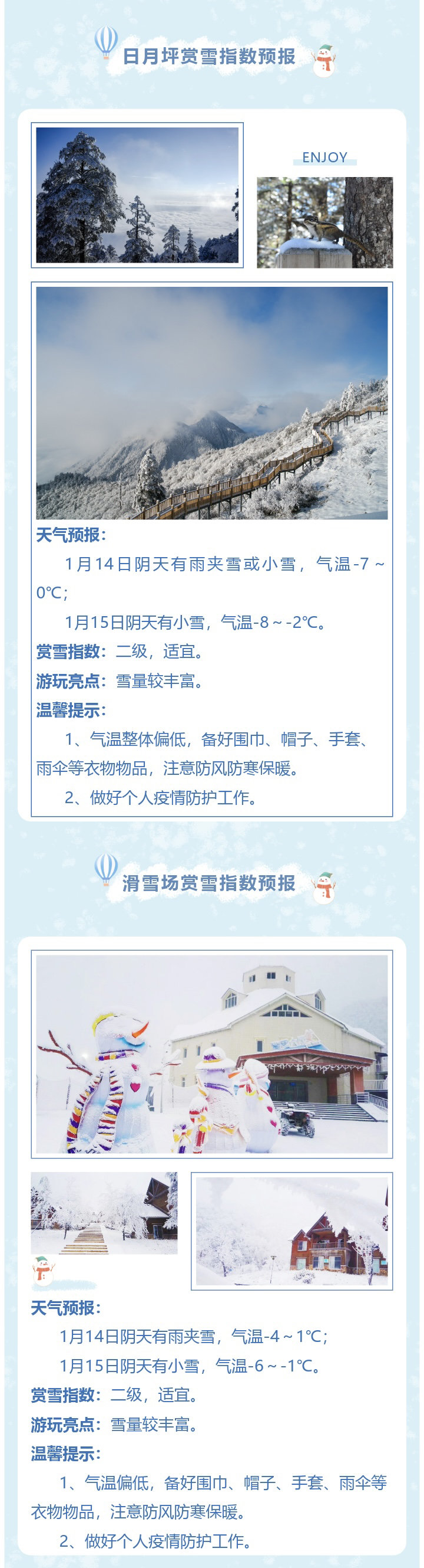 1月13日,大邑县气象局发布赏雪气象指数预报,本周末,西岭雪山的日月坪和滑雪场的赏雪气象指数都是二级,雪量较丰富,适宜赏雪。