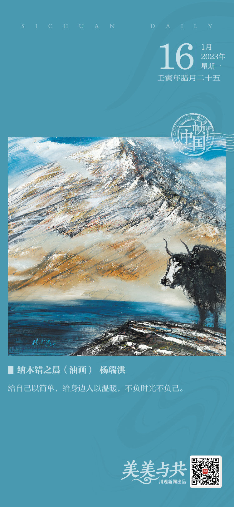 杨瑞洪身处的这片土地,拥有世所罕见的绝美风景,他与同为画家的妻子,经常驾车流连于这令人震撼的自然之美,从而创作出众多独树一帜的风景油画。在他的笔下,有一种让许多自以为熟悉阿坝州、熟悉高原的人所陌生的美:雄浑壮阔的大山、灿烂辉煌的秋色与雪景、暮色等加以组合,融灿烂开阔于悲壮凄美之中。